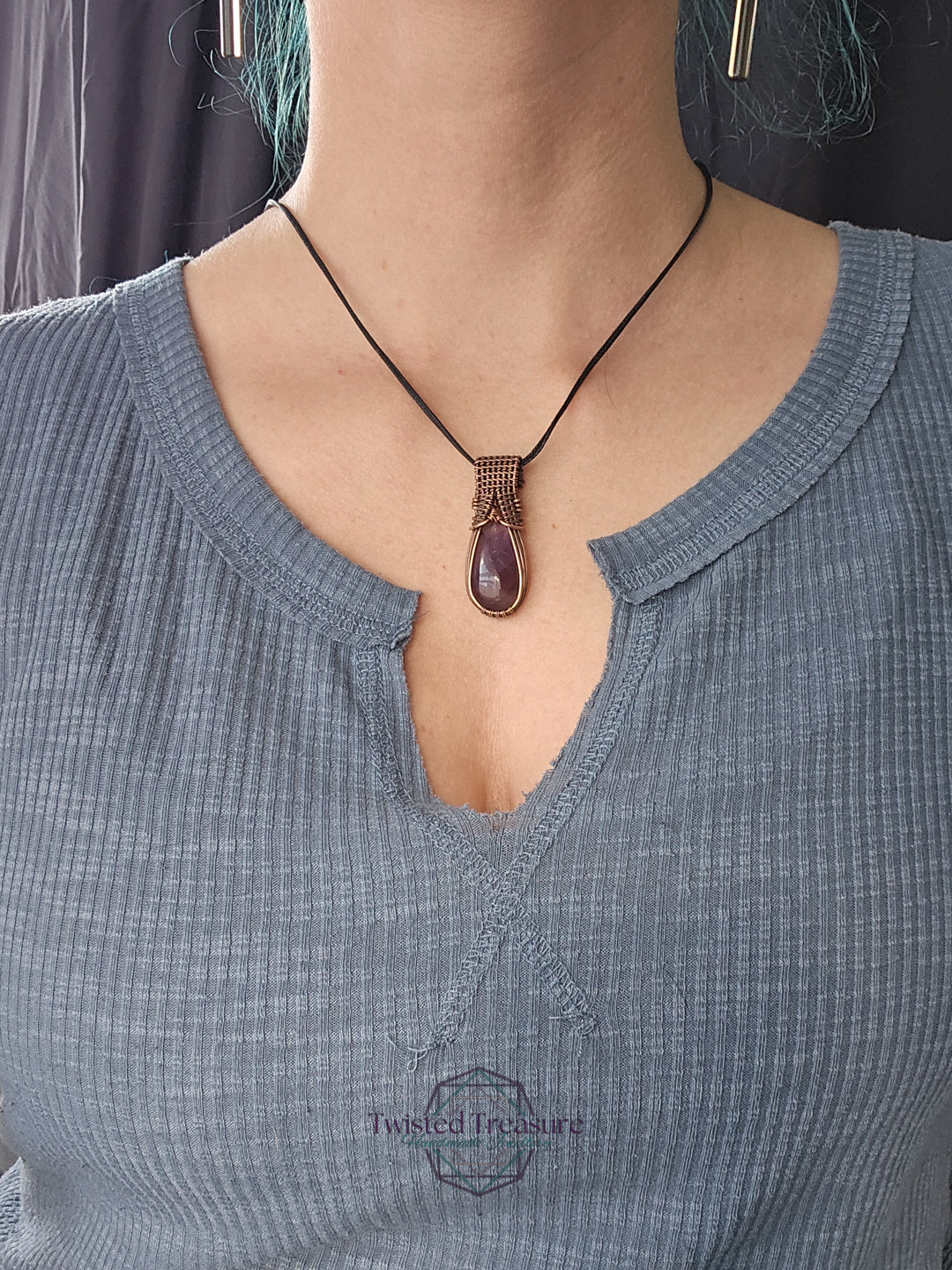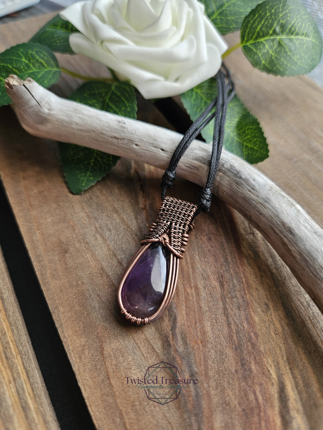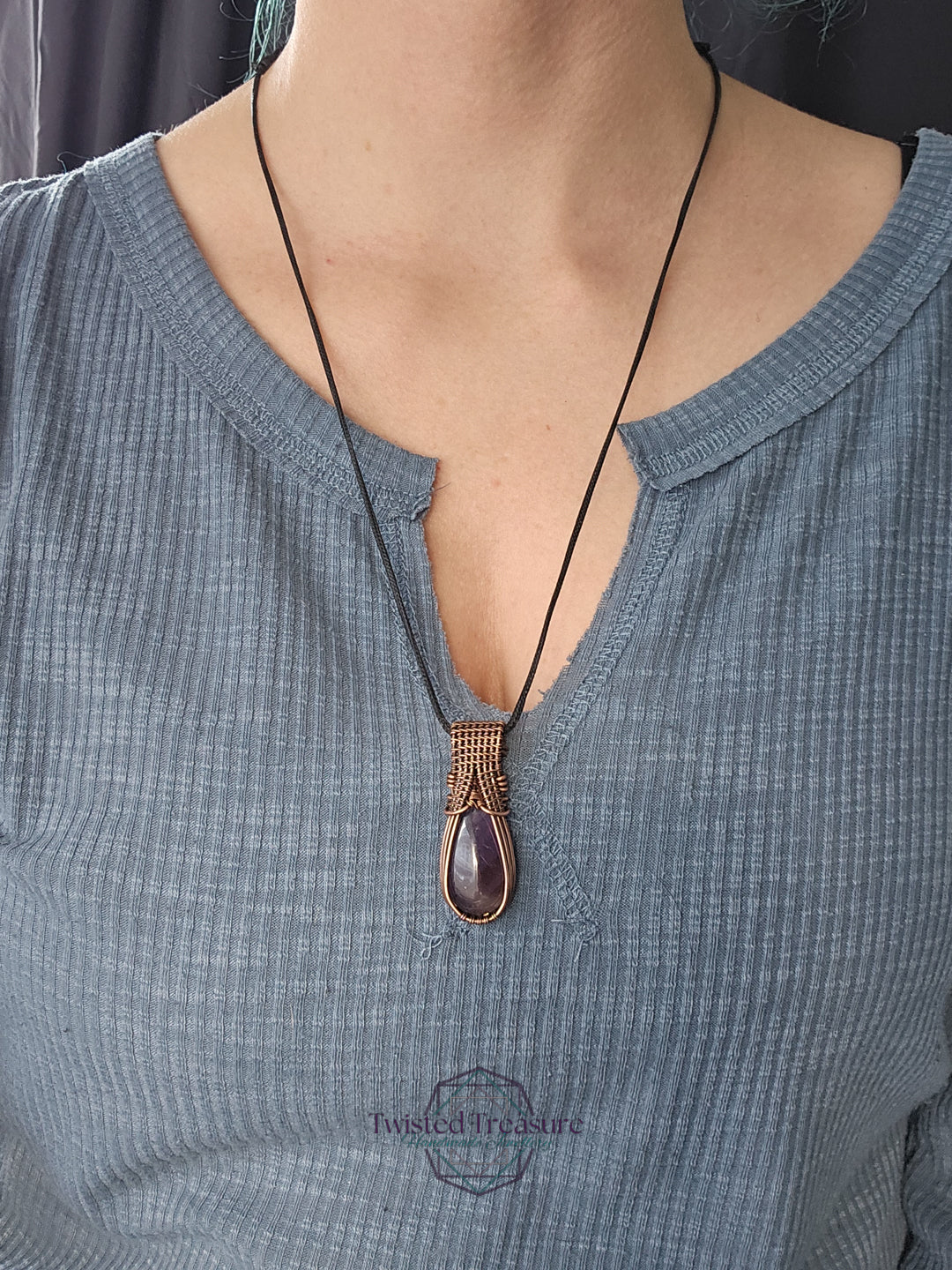 Amethyst woven in oxidized copper wire.