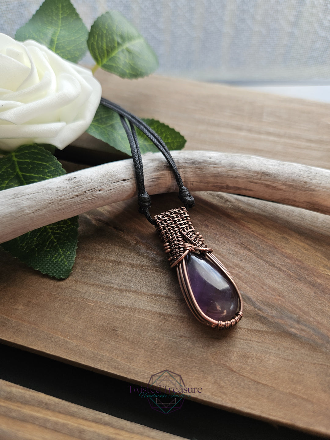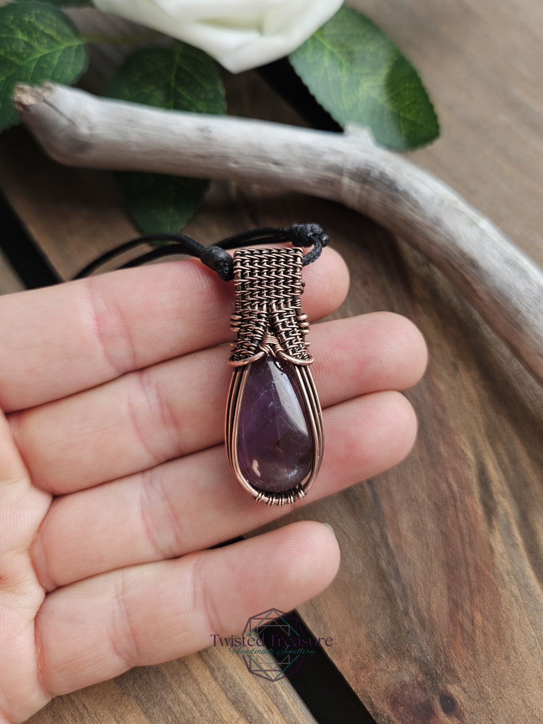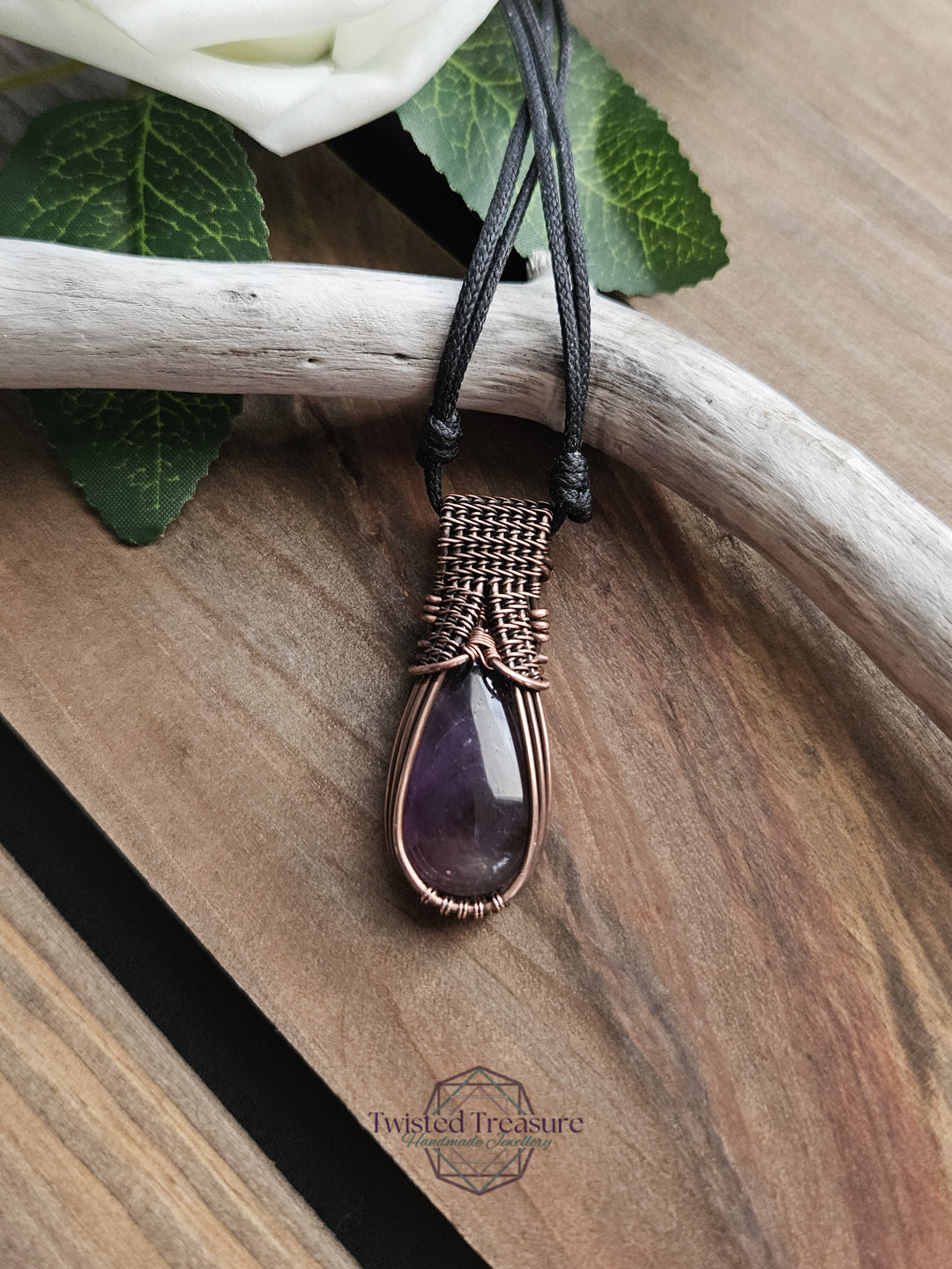 Amethyst woven in oxidized copper wire.