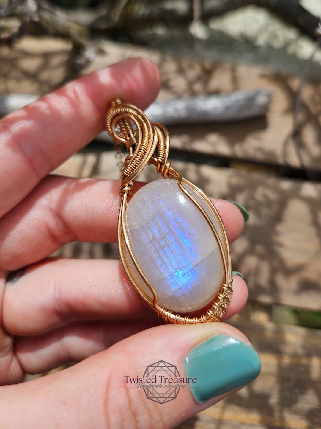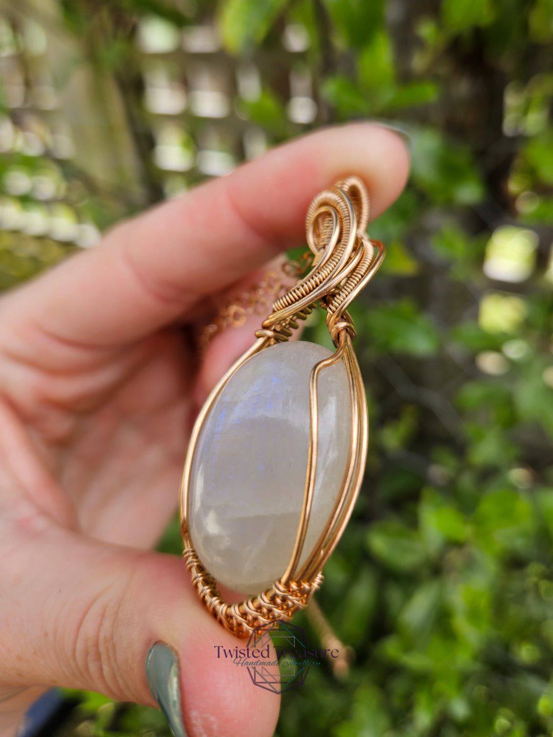 Belomorite wrapped in bronze wire. (Belomorite is a mix of Sunstone and Moonstone)