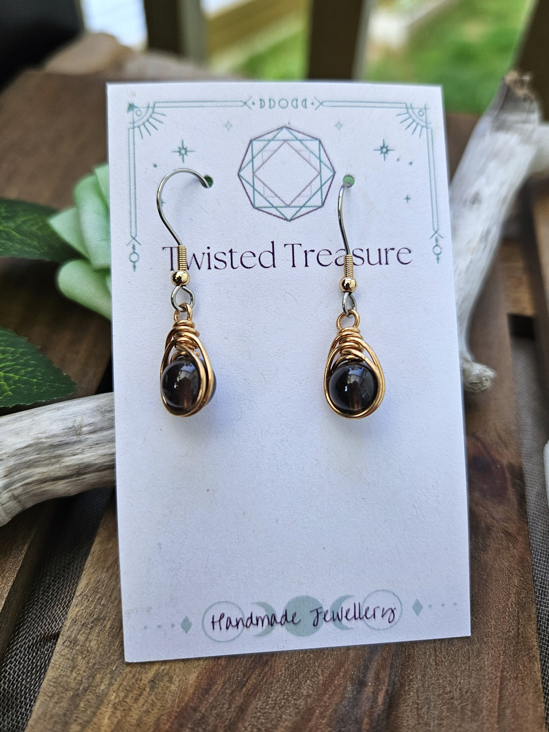 Tektite gemstone beads wrapped with bronze wire and suspended from surgical steel ear wires. The total length is 3.5cm.