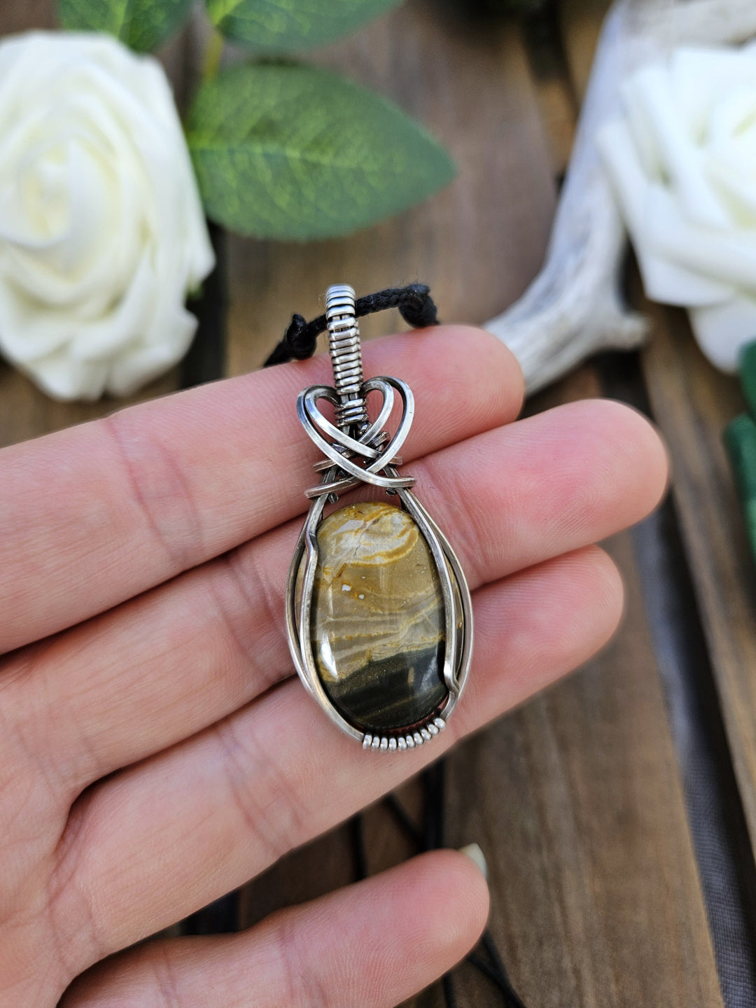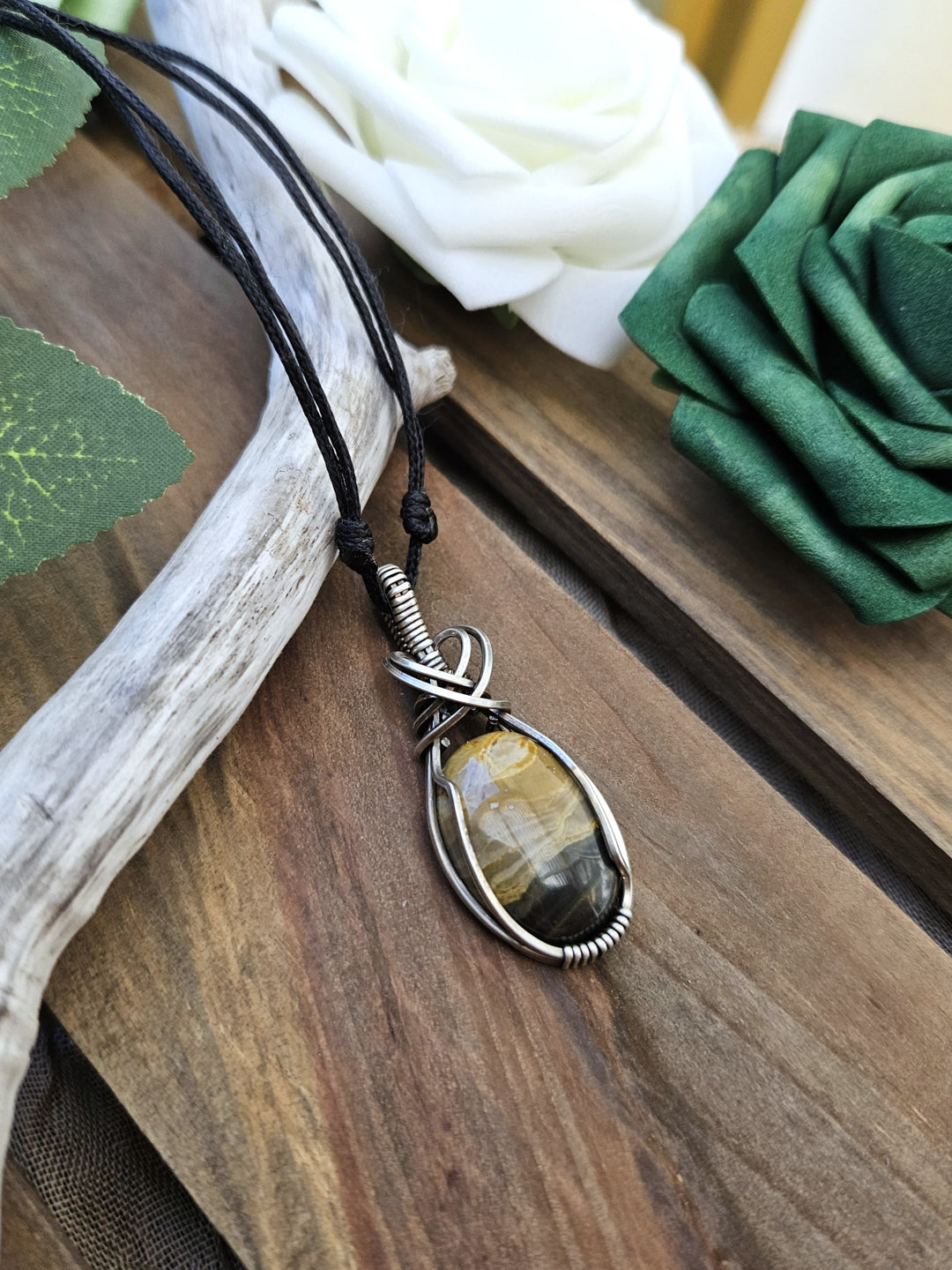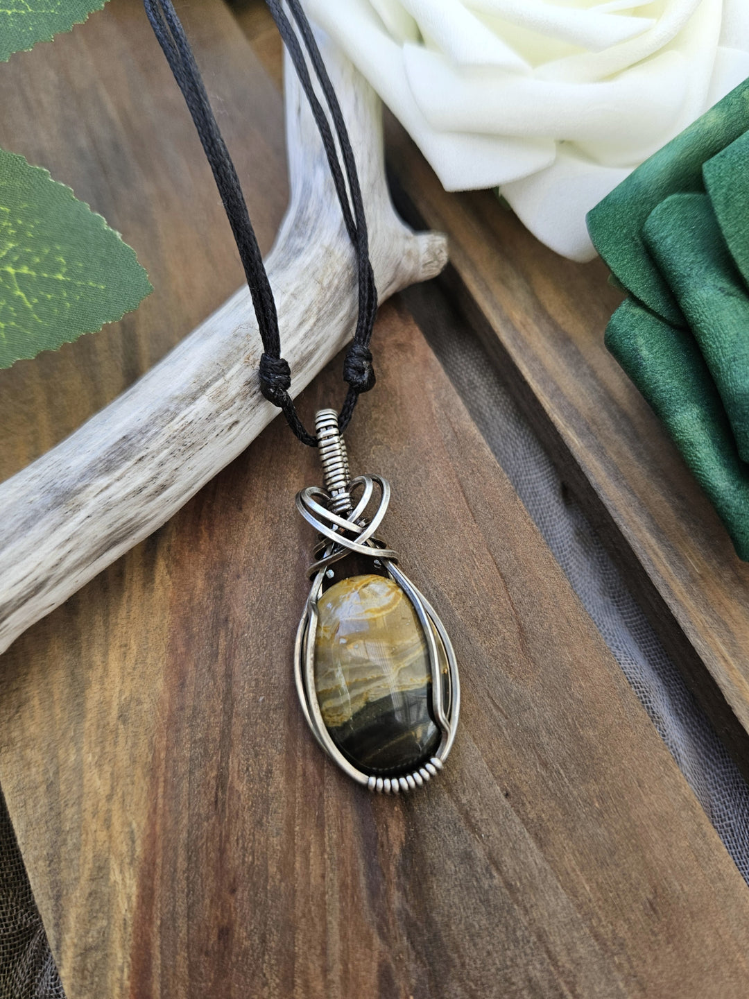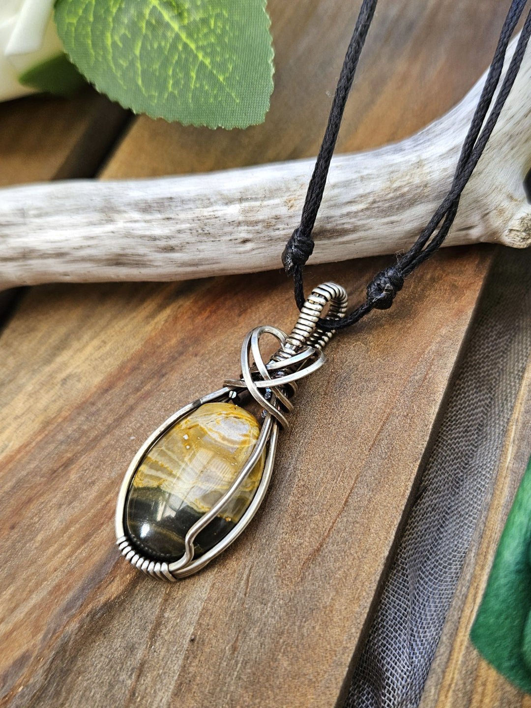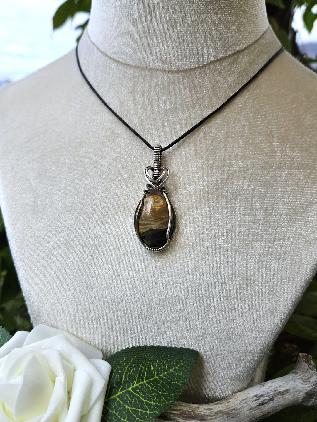 Bumblebee Jasper wrapped in oxidized sterling silver wire.