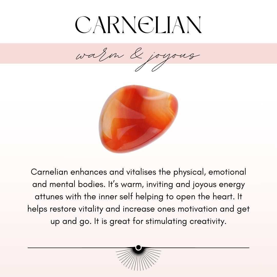 Carnelian is about action. By activating the first three chakras, Carnelian provides a powerful boost to your willpower, with the physical energy and drive to back it up. If your heart wants something, carnelian can give you the confidence and power to go for it.