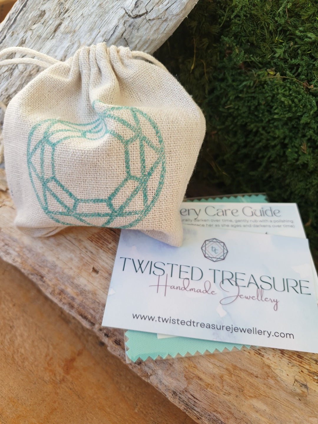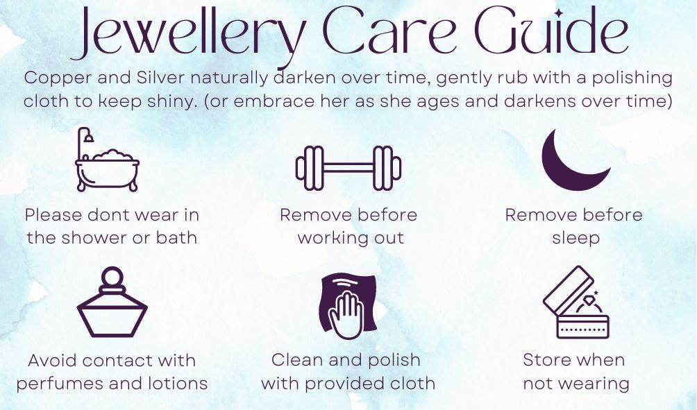 Copper wire will tarnish over time; to keep your jewellery shiny, polish occasionally with the included polishing cloth.