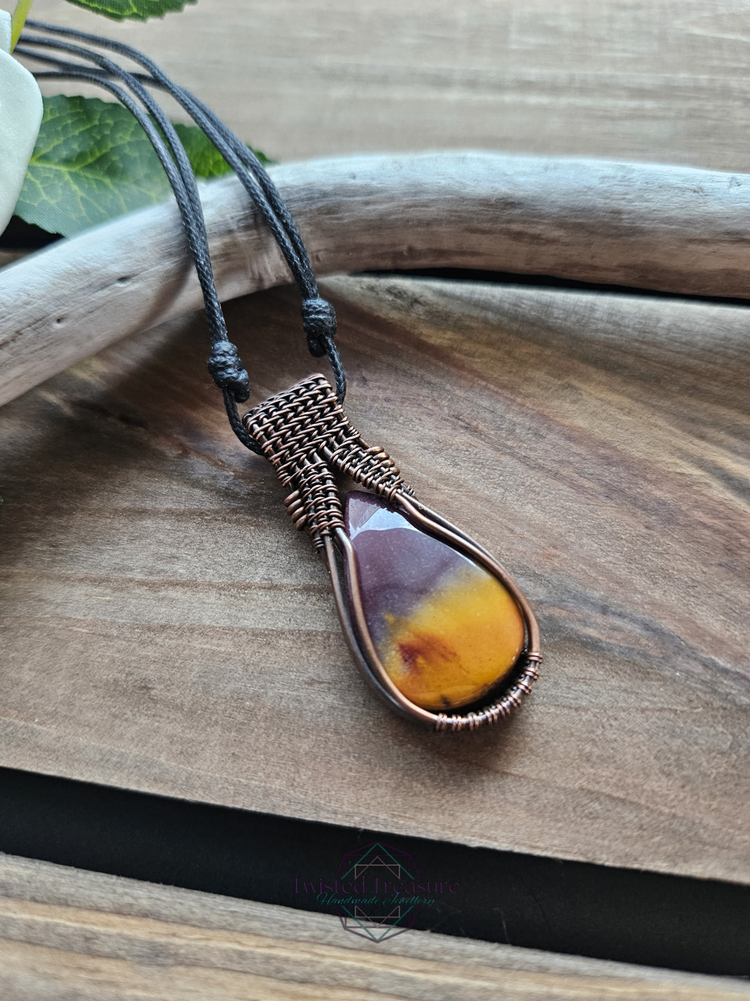 Mookaite woven in oxidized copper wire.