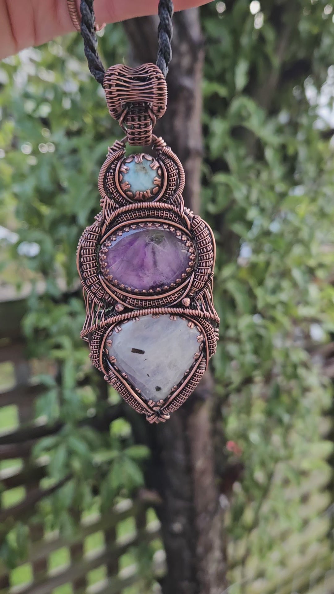 Moonstone, Amethyst and Larimar wrapped in oxidized copper wire.