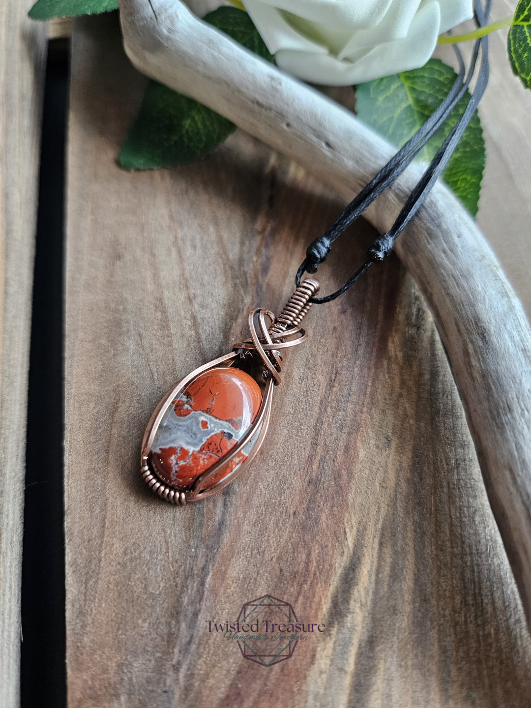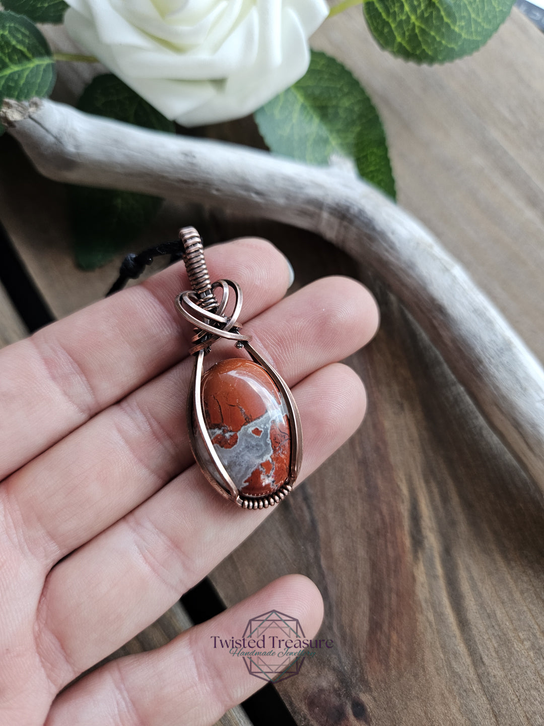 Red Jasper wrapped in oxidized copper wire.