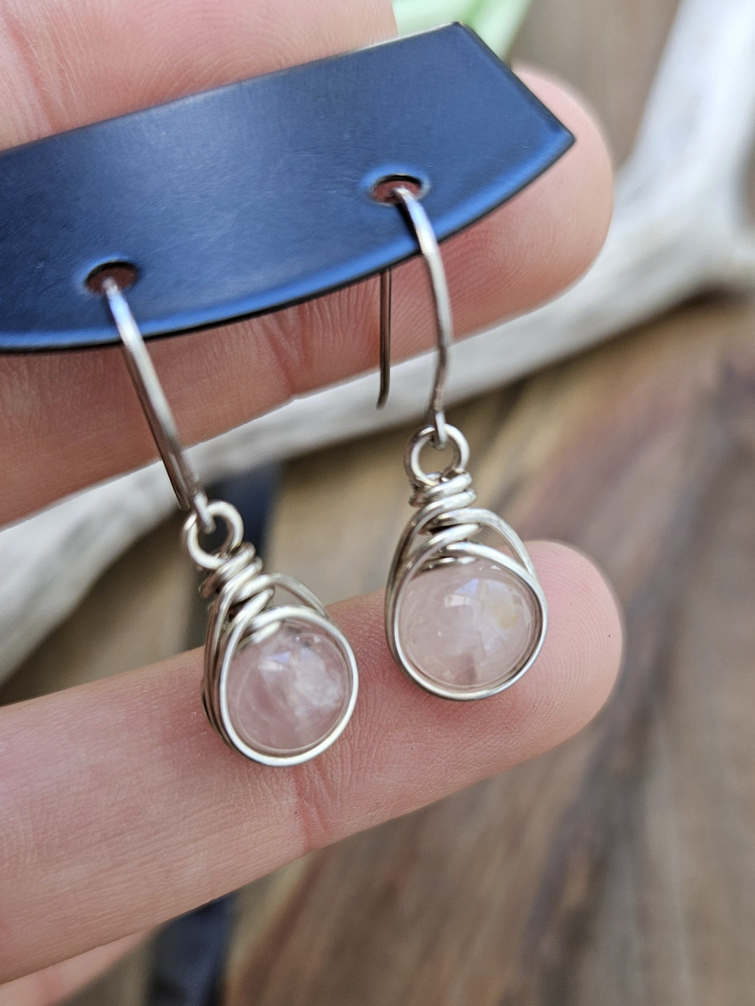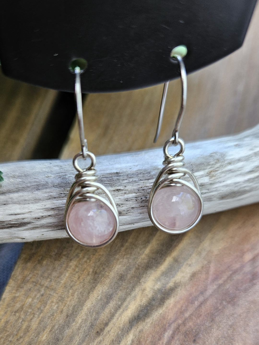 Rose Quartz beads wrapped with sterling silver wire and suspended from surgical steel ear wires. The total length is 3cm.