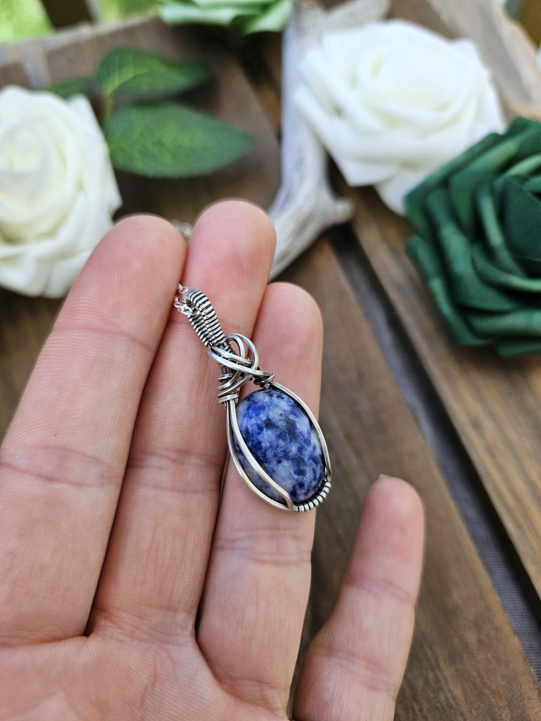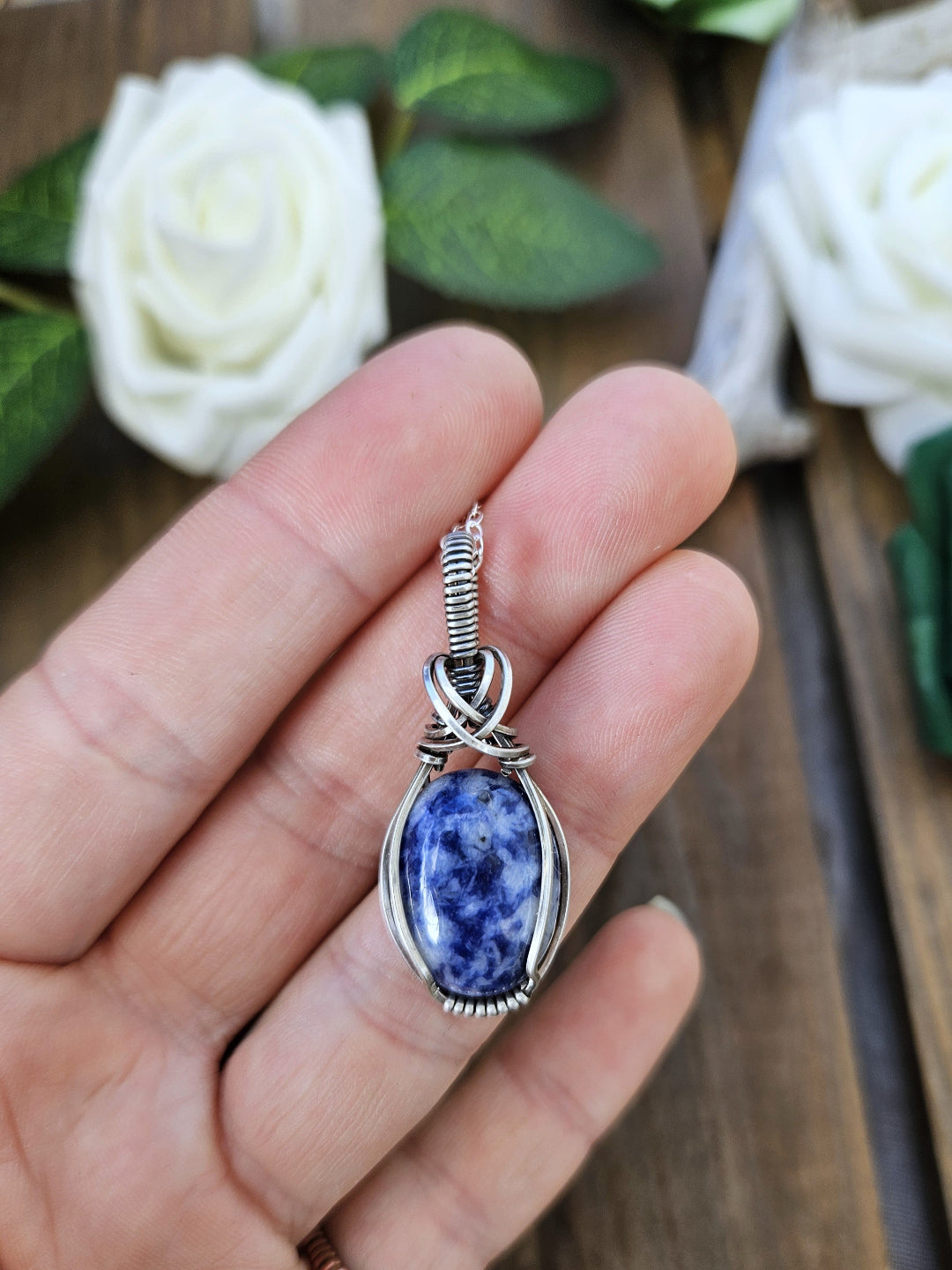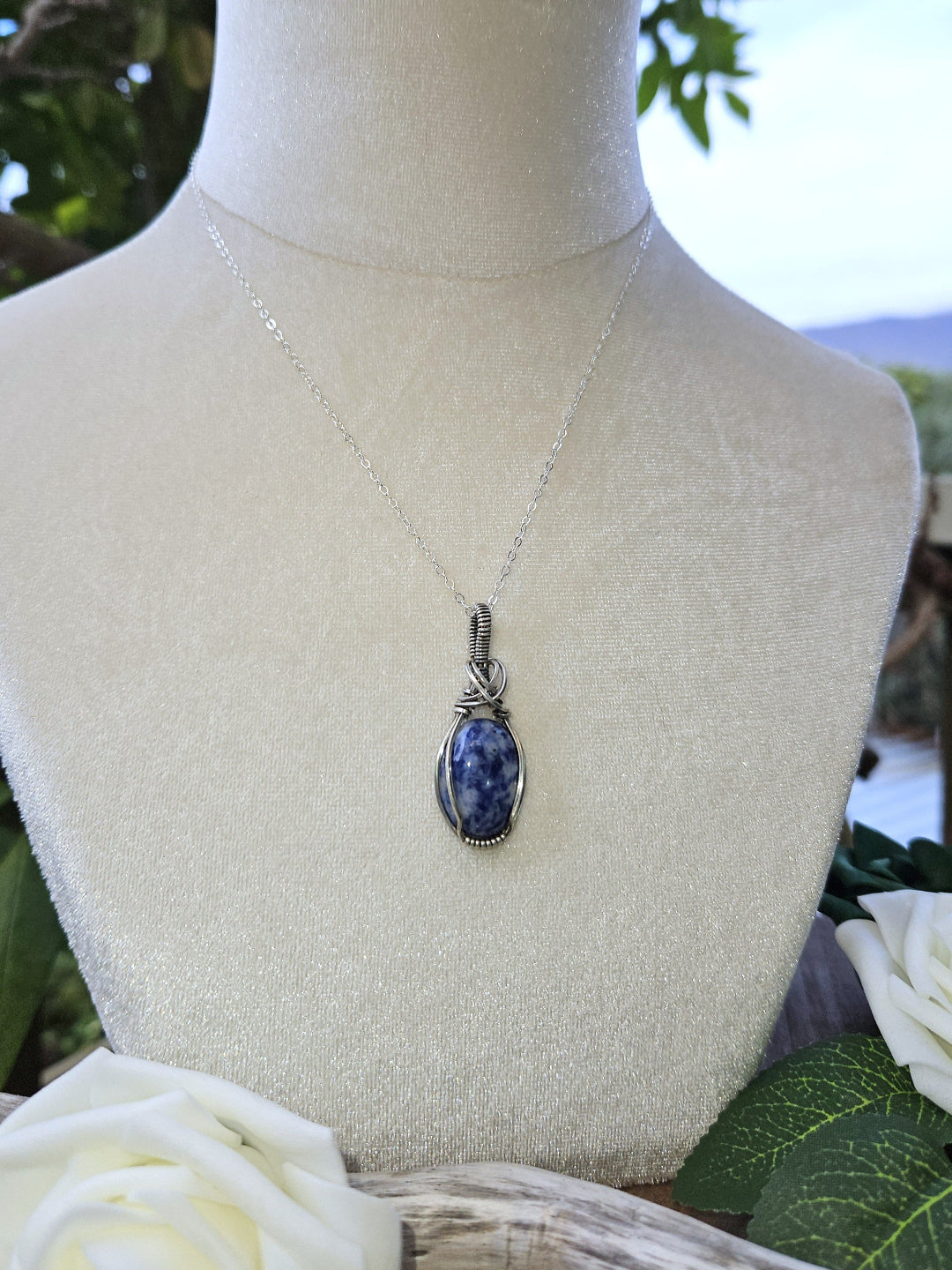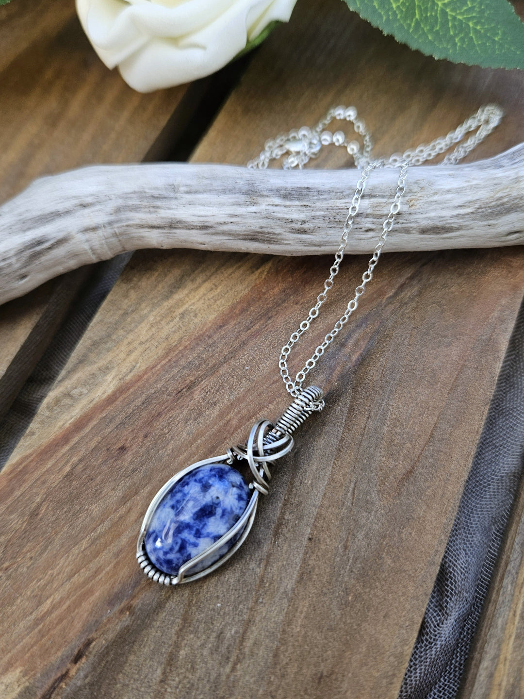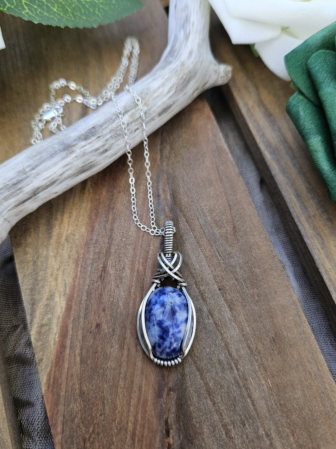 Sodalite wrapped in oxidized sterling silver wire.